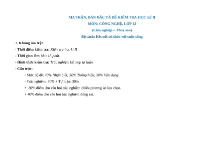 - Tailieugiaovien.com.vn giới thiệu bộ đề Cuối kì 2 Lâm nghiệp Thủy sản đầy đủ ma trận, lời giải chi tiết môn Công nghệ 12 Kết nối tri thức mới nhất năm 2025 nhằm giúp Giáo viên có thêm tài liệu tham khảo ra đề thi Công nghệ 12.