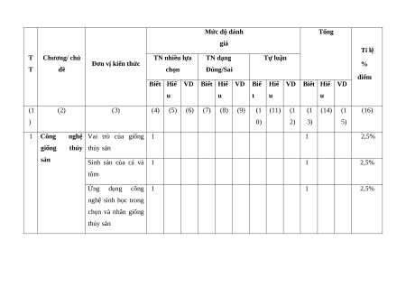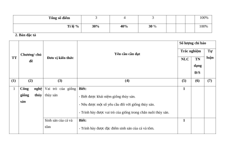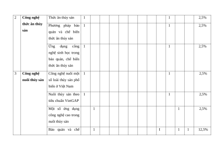 giống thủy thủy sản sản Sinh sản của cá và 1 1 2,5% tôm Ứng dụng công 1 1 2,5% nghệ sinh học trong chọn và nhân giống thủy sản 2 Công nghệ Thức ăn thủy sản 1 1 2,5% thức ăn thủy Phương pháp bảo 1 1 2,5% sản quản và chế biến thức ăn thủy sản Ứng dụng công 1 1 2,5% nghệ sinh học trong bảo quản, chế biến thức ăn thủy sản 3 Công nghệ Công nghệ nuôi một 1 1 2,5% nuôi thủy sản số loài thủy sản phổ biến ở Việt Nam Nuôi thủy sản theo 1 1 2,5% tiêu chuẩn VietGAP Một số ứng dụng 1 1 2,5% công nghệ cao trong nuôi thủy sản Bảo quản và chế 1 I 1 1 12,5% biến sản phẩm thủy sản 4 Phòng, trị Vai trò của phòng, 1 II 1 1 22,5%