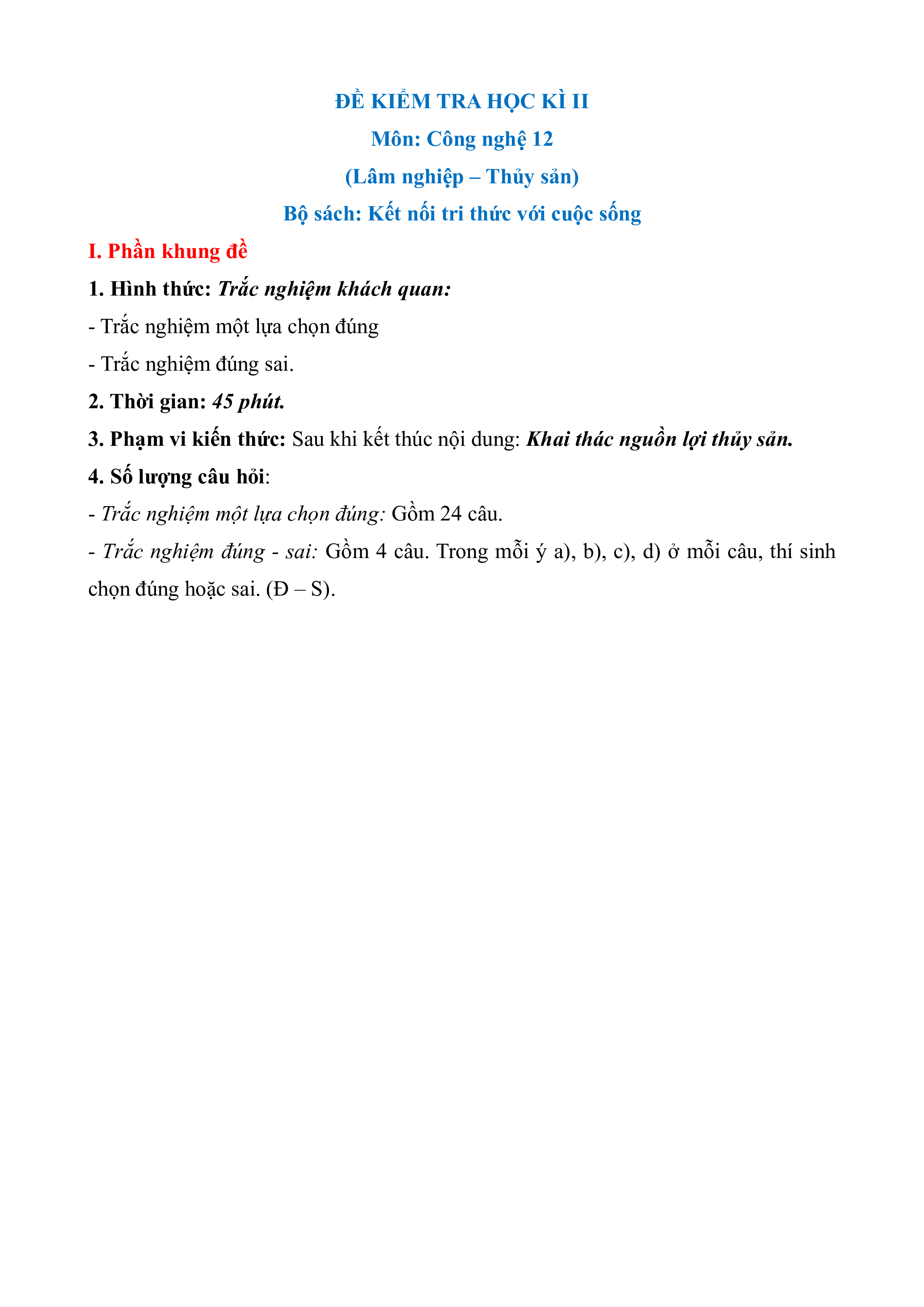 - Tailieugiaovien.com.vn giới thiệu bộ đề Cuối kì 2 Lâm nghiệp Thủy sản đầy đủ ma trận, lời giải chi tiết môn Công nghệ 12 Kết nối tri thức mới nhất nhằm giúp Giáo viên có thêm tài liệu tham khảo ra đề thi Công nghệ 12.
