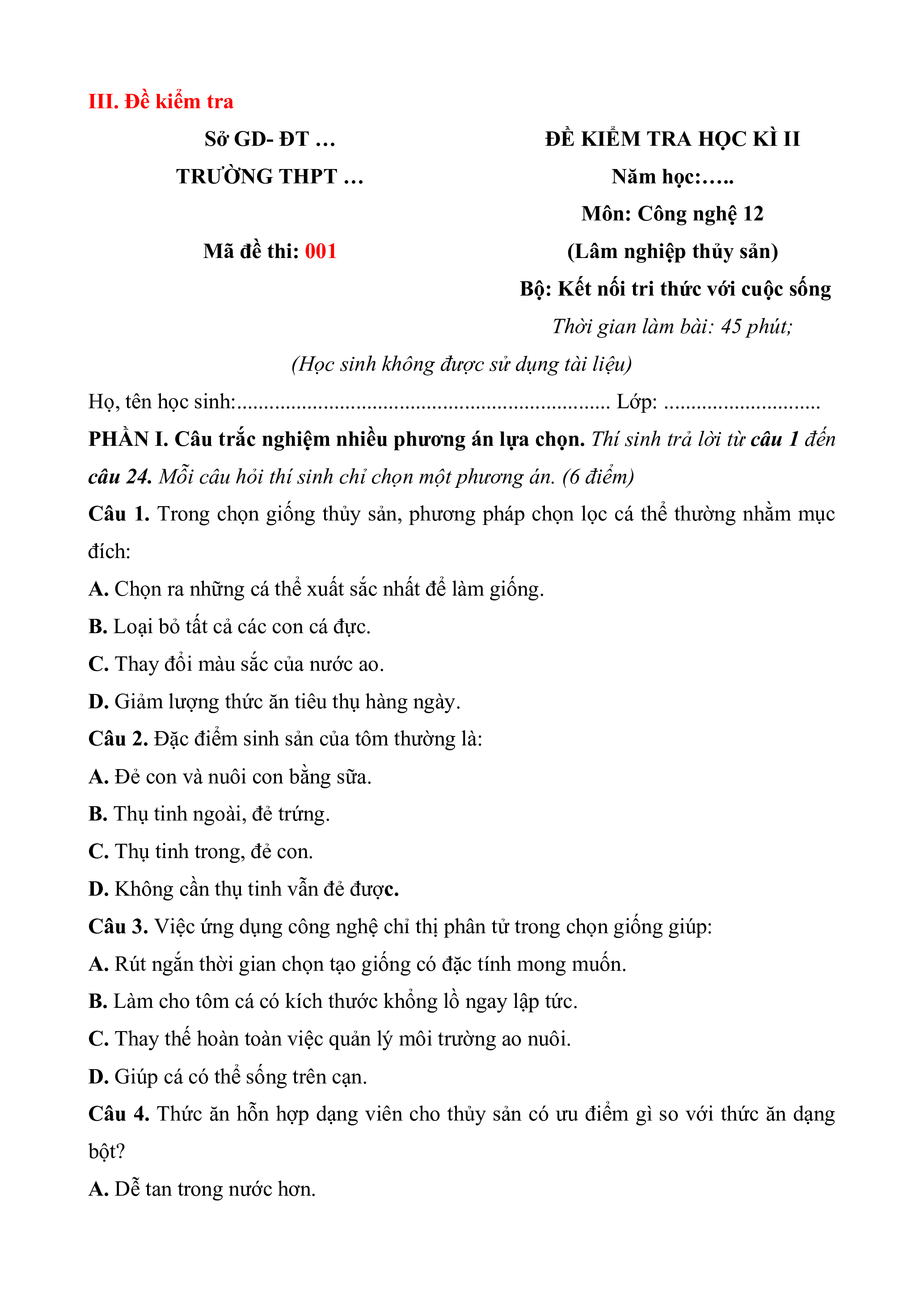 Đề thi Cuối kì 2 Công nghệ Lâm nghiệp Thủy sản 12 Kết nối tri thức