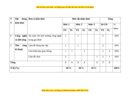 Thủ công Làm đồ dùng học tập 1 1 2 20% kĩ thuật Làm biển báo giao thông 1 1 1 1 2 30% Làm đồ chơi 2 1 2 1 30% Tổng 5 1 2 1 1 7 3 Tỉ lệ (%) 60 % 30 % 10 % 100%