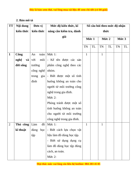 - Phần tự luận: 3,0 điểm (Mức 1: 2,0 điểm; Mức 2: 1,0 điểm).
