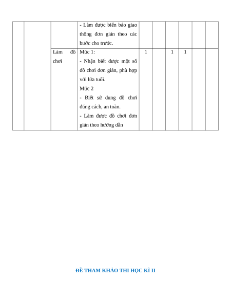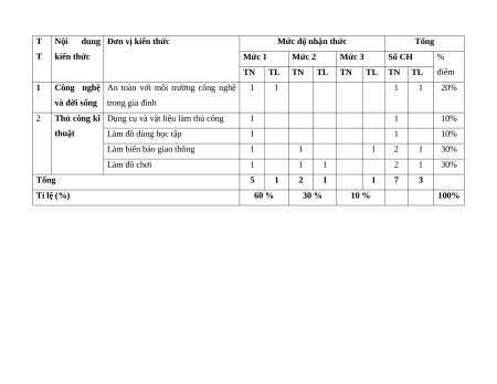 Thủ công kĩ Dụng cụ và vật liệu làm thủ công 1 1 10% thuật Làm đồ dùng học tập 1 1 10% Làm biển báo giao thông 1 1 1 2 1 30% Làm đồ chơi 1 1 1 2 1 30% Tổng 5 1 2 1 1 7 3 Tỉ lệ (%) 60 % 30 % 10 % 100% 2. Bản mô tả TT Nội dung Đơn vị