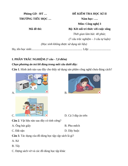 Đề thi cuối kì 2 Công nghệ lớp 3 Kết nối tri thức (Đề 1)