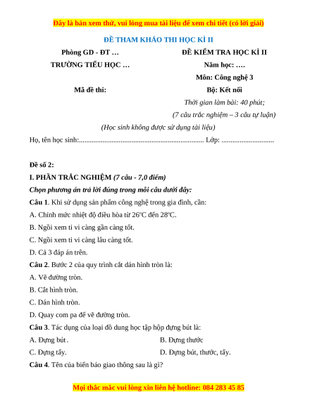 Đề thi cuối kì 2 Công nghệ lớp 3 Kết nối tri thức (Đề 3)