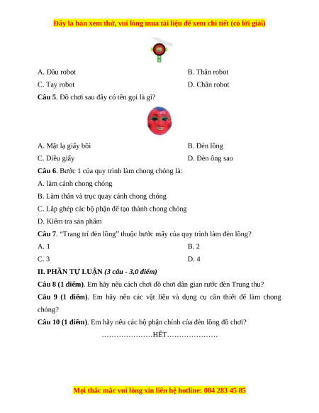 Câu 10 (1 điểm). Em hãy nêu các bộ phận chính của đèn lồng đồ chơi?