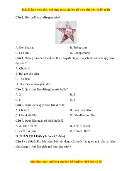 Câu 6. Bước 3 của quy trình làm diều là: A. Chuẩn bị B. Làm thân diều C. Làm đuôi diều D. Gắn dây cho diều