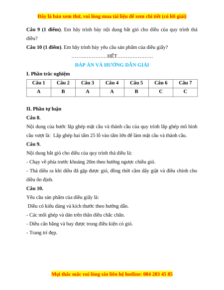 Câu 10 (1 điểm). Em hãy trình bày yêu cầu sản phẩm của diều giấy?