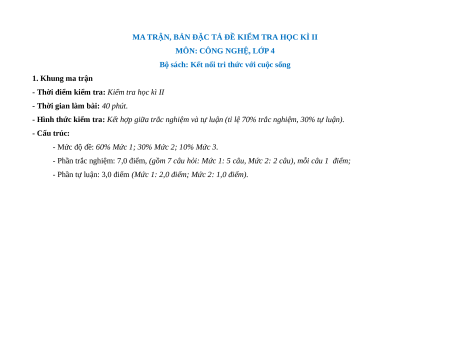 - Tailieugiaovien.com.vn giới thiệu bộ đề cuối kì 2 gồm đầy đủ ma trận và lời giải chi tiết môn Công nghệ lớp 4 Kết nối tri thức mới nhất nhằm giúp Giáo viên có thêm tài liệu tham khảo ra đề thi Công nghệ lớp 4.