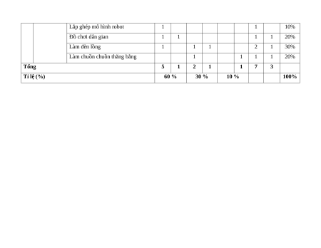 Lắp ghép mô hình bập bênh 1 1 10% Lắp ghép mô hình robot 1 1 10% Đồ chơi dân gian 1 1 1 1 20% Làm đèn lồng 1 1 1 2 1 30%