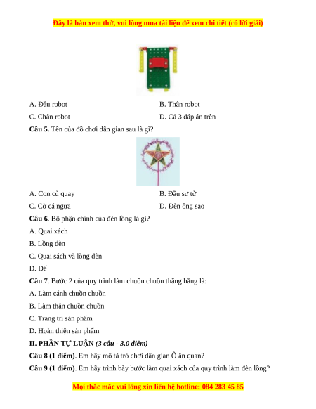 Câu 6. Bộ phận chính của đèn lồng là gì? A. Quai xách B. Lồng đèn C. Quai sách và lồng đèn D. Đế
