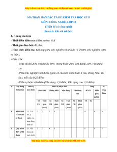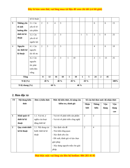 Mức độ nhận thức Tổng % kiến thức kiến thức tổng Nhận biết Thông hiểu Vận dụng Vận dụng Số CH Thời điểm cao gian (phút) Số Thời Số Thời Số Thời Số Thời TN TL CH gian CH gian CH gian CH gian (phút) (phút) (phút) (phút) 1 Khái quát 1.1. Vai 2 3 2 3 4 6 10 về thiết kế trò, ý kĩ thuật nghĩa của hoạt động thiết kế 2 Quy trình 2.1. Nội 2 3 4 3 6 6 15 thiết kế kĩ dung các thuật bước thiết