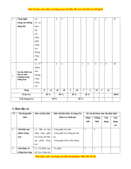 Sự cần thiết của môi bảo vệ môi 5 trường trường trong trồng trọt trong trồng trọt Tổng 8 12 16 18 1 10 1 5 24 2 45 Tỉ lệ (%) 20 % 40 % 20 % 20 % 100% Tỉ lệ chung (%) 60 % 40 % 2. Bản đặc tả TT Nội dung kiến