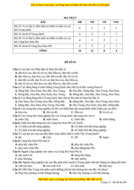 Câu 15: Ngành công nghiệp nào sau đây ở Cộng hòa Nam Phi phát triển mạnh với hàng nghìn doanh nghiệp hoạt động? A. Hóa chất. B. Điện tử. C. Chế tạo máy. D. Luyện kim.