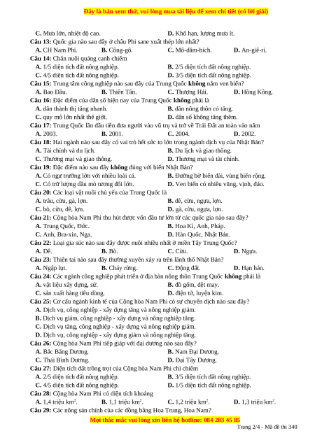 Câu 28: Cộng hòa Nam Phi có diện tích khoảng A. 1,4 triệu km2. B. 1,1 triệu km2. C. 1,2 triệu km2. D. 1,3 triệu km2.