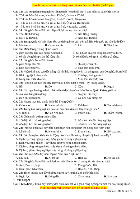 Câu 28: Thiên tai nào sau đây thường xuyên xảy ra trên lãnh thổ Nhật Bản? A. Ngập lụt. B. Động đất. C. Cháy rừng. D. Hạn hán. II. TỰ LUẬN