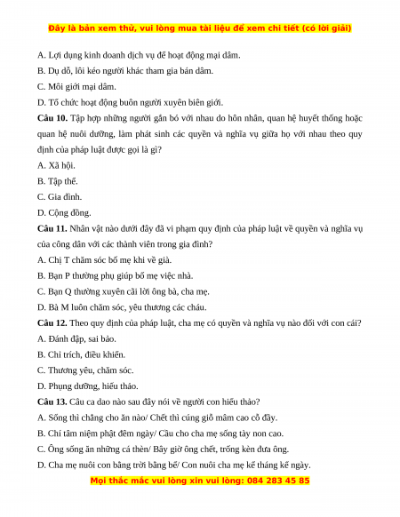 Câu 12. Theo quy định của pháp luật, cha mẹ có quyền và nghĩa vụ nào đối với con cái? A. Đánh đập, sai bảo.