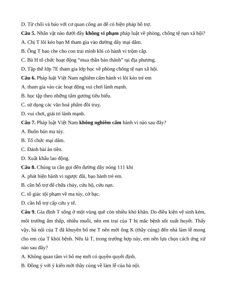Câu 6. Pháp luật Việt Nam nghiêm cấm hành vi lôi kéo trẻ em