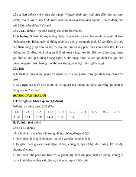 Câu 1 (1,0 điểm): Trong phòng, chống tệ nạn xã hội, công dân có trách nhiệm như thế nào?