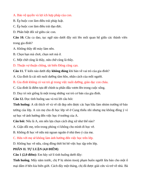 Câu 11. Ý kiến nào dưới đây không đúng khi bàn về vai trò của gia đình?