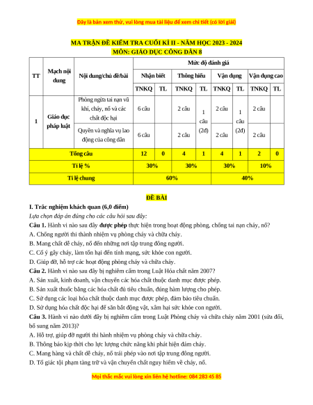 Nội dung/chủ đề/bài Nhận biết Thông hiểu Vận dụng Vận dụng cao dung TNKQ TL TNKQ TL TNKQ TL TNKQ TL Phòng ngừa tai nạn vũ khí, cháy, nổ và các 6 câu 2 câu 2 câu 2 câu 1 1 Giáo dục chất độc hại 1 câu câu pháp luật Quyền và nghĩa vụ lao (2đ) (2đ) 6 câu 2 câu 2 câu 2 câu động của công dân Tổng câu 12 0 4 1 4 1 2 0 Tỉ lệ % 30% 30% 30% 10% Tỉ lệ chung 60% 40% ĐỀ BÀI