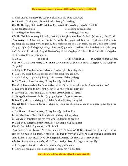 Câu 18. Theo quy định của Bộ luật Lao động năm 2019: lao động chưa đủ 18 tuổi là A. lao động thành niên.