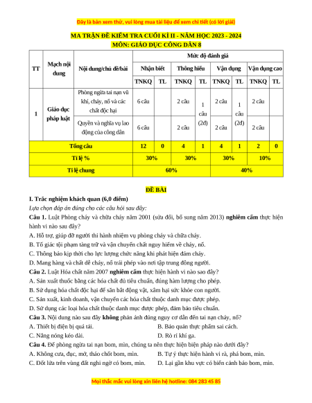 Nội dung/chủ đề/bài Nhận biết Thông hiểu Vận dụng Vận dụng cao dung TNKQ TL TNKQ TL TNKQ TL TNKQ TL Phòng ngừa tai nạn vũ khí, cháy, nổ và các 6 câu 2 câu 2 câu 2 câu 1 1 Giáo dục chất độc hại 1 câu câu pháp luật Quyền và nghĩa vụ lao (2đ) (2đ) 6 câu 2 câu 2 câu 2 câu động của công dân Tổng câu 12 0 4 1 4 1 2 0 Tỉ lệ % 30% 30% 30% 10% Tỉ lệ chung 60% 40% ĐỀ BÀI