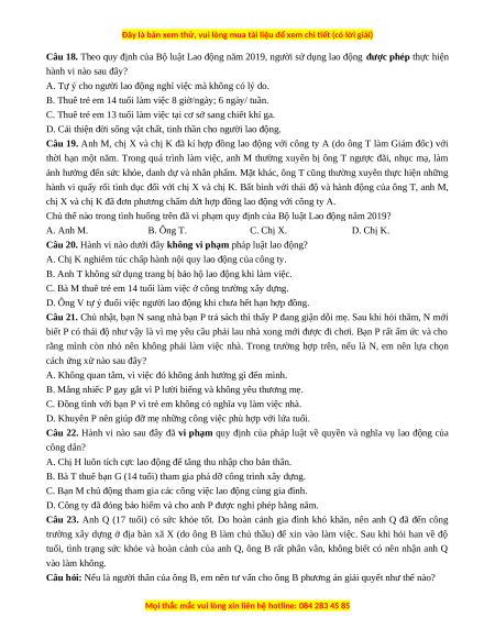 Câu 20. Hành vi nào dưới đây không vi phạm pháp luật lao động?