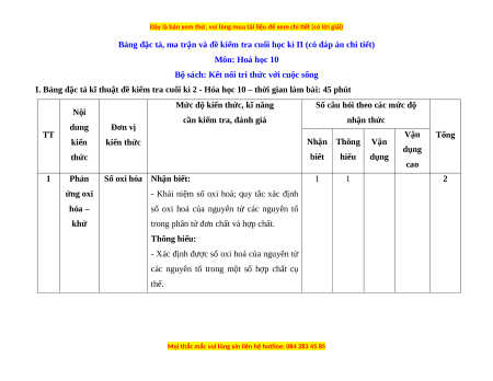 Bảng đặc tả, ma trận và đề kiểm tra cuối học kì II (có đáp án chi tiết) Môn: Hoá học 10