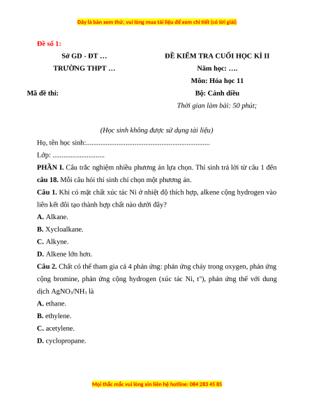 Câu 1. Khi có mặt chất xúc tác Ni ở nhiệt độ thích hợp, alkene cộng hydrogen vào