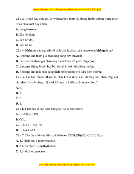 Câu 3. Arene hay còn gọi là hydrocarbon thơm là những hydrocarbon trong phân