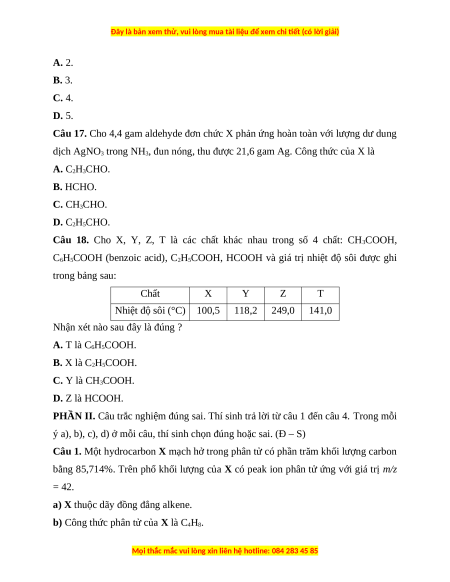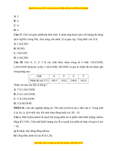 Câu 16. Hợp chất có công thức C5H10O. Số đồng phân aldehyde của hợp chất là