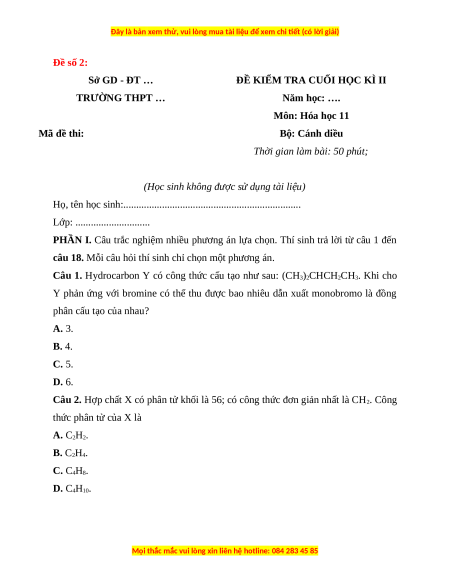 Đề thi cuối kì 2 Hóa Học 11 Cánh diều (Đề 2)
