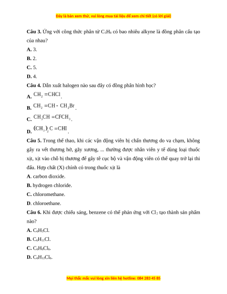 Câu 3. Ứng với công thức phân tử C5H8 có bao nhiêu alkyne là đồng phân cấu tạo của nhau? A. 3. B. 2. C. 5. D. 4.