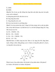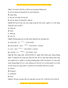 Câu 9. Phương pháp nào sau đây được dùng để sản xuất giấm ăn? A. 2CH3CHO + O2 2CH3COOH. B. CH3COOCH3 + H2O CH3COOH + CH3OH. C. C2H2 + H2O CH3COOH + CH3OH D. C2H5OH + O2 CH3COOH + H2O