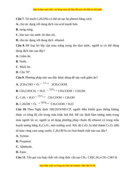Câu 8. Để loại bỏ lớp cặn màu trắng trong ấm đun nước, người ta có thể dùng dung dịch nào sau đây? A. Giấm ăn. B. Nước. C. Muối ăn. D. Cồn 70°.
