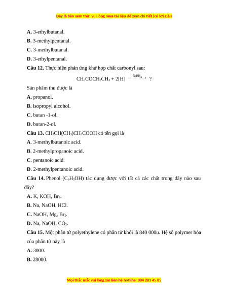 Câu 12. Thực hiện phản ứng khử hợp chất carbonyl sau: CH3COCH2CH3 + 2[H] ? Sản phẩm thu được là A. propanol. B. isopropyl alcohol. C. butan -1-ol. D. butan-2-ol.
