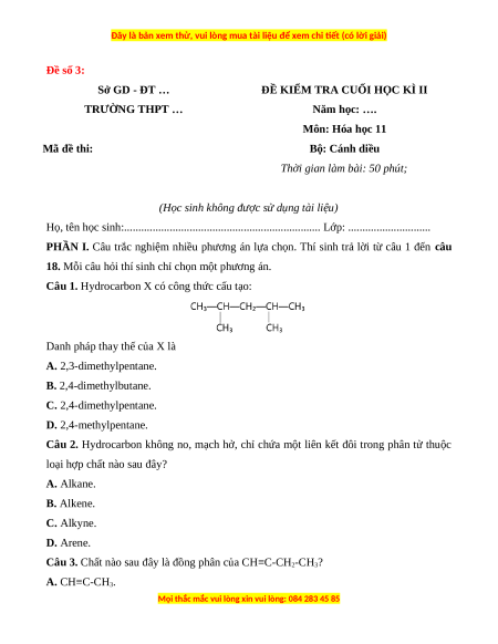 - Tailieugiaovien.com.vn giới thiệu bộ 3 đề cuối kì 2 gồm đầy đủ ma trận và lời giải chi tiết môn Hóa học 11 Cánh diều mới nhất năm 2023 - 2024 nhằm giúp Giáo viên có thêm tài liệu tham khảo ra đề thi Hóa học lớp 11.