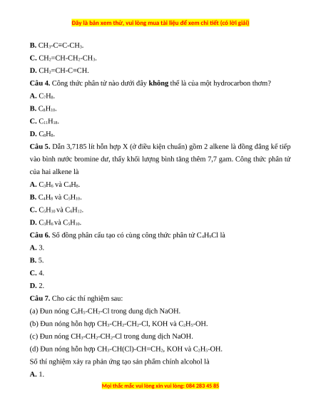 Câu 2. Hydrocarbon không no, mạch hở, chỉ chứa một liên kết đôi trong phân tử thuộc