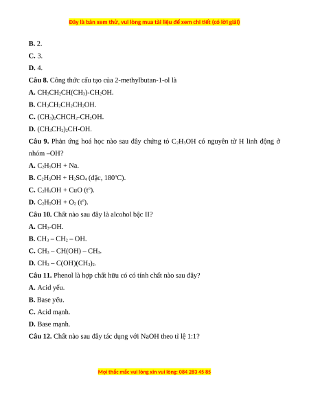 Câu 8. Công thức cấu tạo của 2-methylbutan-1-ol là A. CH3CH2CH(CH3)-CH2OH. B. CH3CH2CH2CH2OH. C. (CH3)2CHCH2-CH2OH. D. (CH3CH2)2CH-OH.