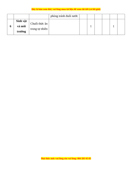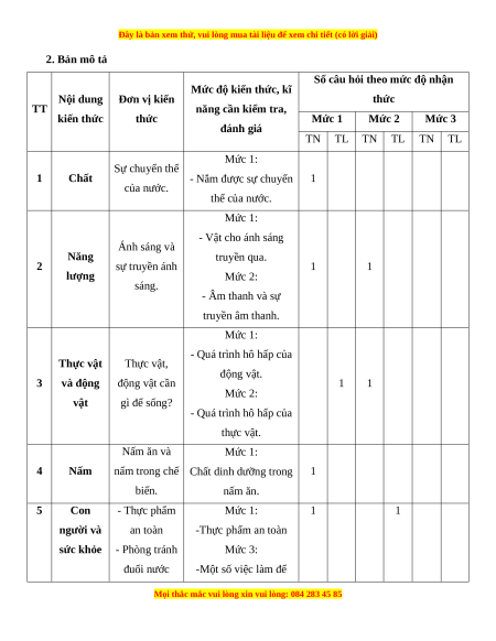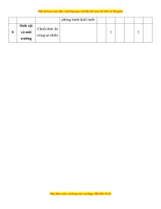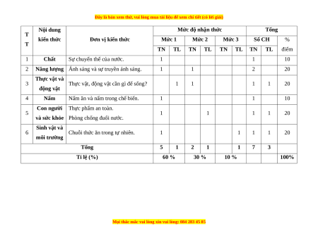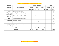 - Nắm được sự chuyển 1 của nước. thể của nước. Mức 1: - Vật cho ánh sáng Ánh sáng và Năng truyền qua. 2 sự truyền ánh 1 1 lượng Mức 2: sáng. - Âm thanh và sự truyền âm thanh. Mức 1: - Quá trình hô hấp của Thực vật Thực vật, động vật. 3 và động động vật cần 1 1 Mức 2: vật gì để sống? - Quá trình hô hấp của thực vật. Nấm ăn và Mức 1: 4 Nấm