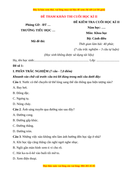 Đề thi cuối kì 2 Khoa học lớp 4 Cánh diều có đáp án