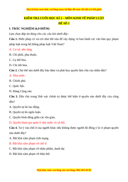 KIỂM TRA CUỐI HỌC KÌ 2 – MÔN KINH TẾ PHÁP LUẬT ĐỀ SỐ 1
