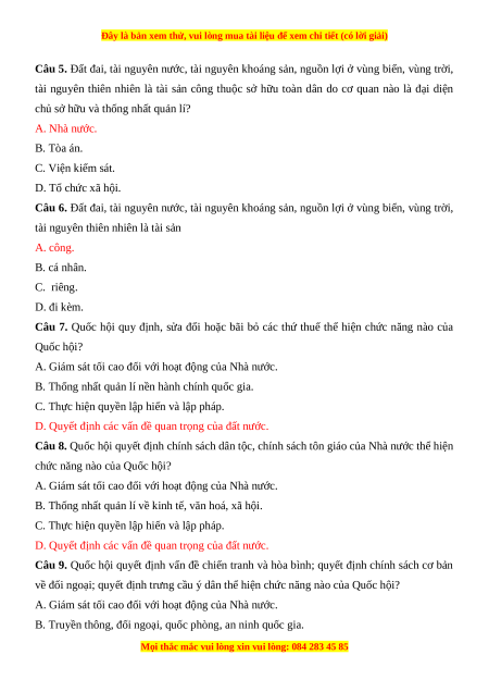 Câu 9. Quốc hội quyết định vấn đề chiến tranh và hòa bình; quyết định chính sách cơ bản