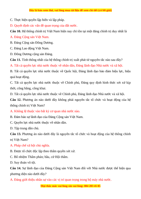 Câu 10. Hệ thống chính trị Việt Nam hiện nay chỉ tồn tại một đảng chính trị duy nhất là