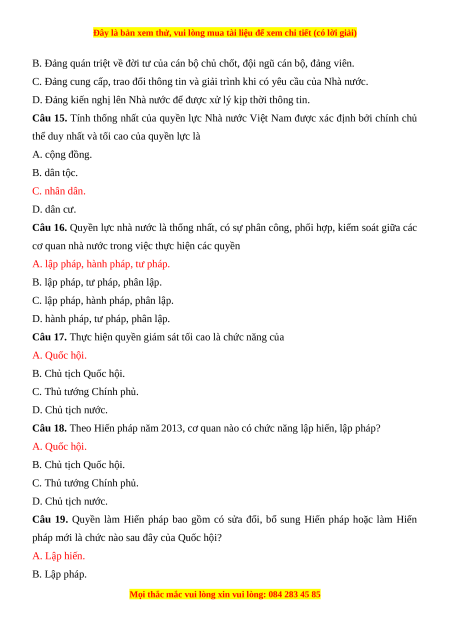 Câu 18. Theo Hiến pháp năm 2013, cơ quan nào có chức năng lập hiến, lập pháp? A. Quốc hội. B. Chủ tịch Quốc hội.