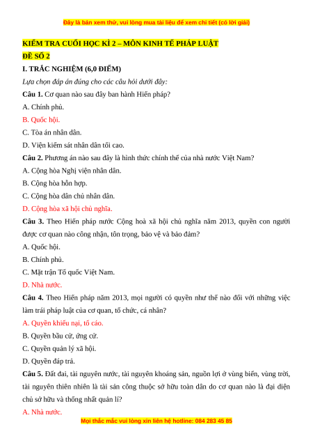 Câu 1. Cơ quan nào sau đây ban hành Hiến pháp? A. Chính phủ. B. Quốc hội. C. Tòa án nhân dân.