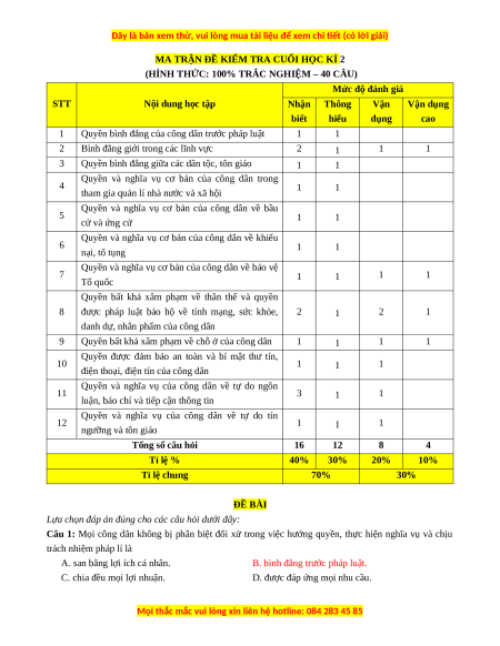 Quyền và nghĩa vụ của công dân về tự do tín 12 1 1 1 ngưỡng và tôn giáo Tổng số câu hỏi 16 12 8 4 Tỉ lệ % 40% 30% 20% 10% Tỉ lệ chung 70% 30% ĐỀ BÀI