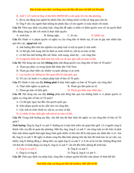 Câu 16: Nội dung nào sau đây không phản ánh đúng quyền của công dân về bảo vệ Tổ quốc?