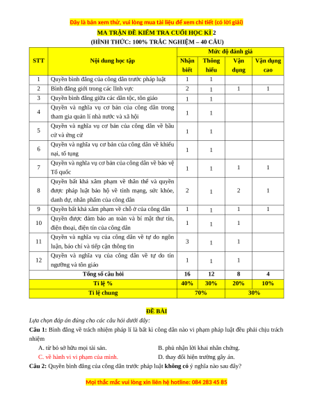Quyền và nghĩa vụ của công dân về tự do tín 12 1 1 1 ngưỡng và tôn giáo Tổng số câu hỏi 16 12 8 4 Tỉ lệ % 40% 30% 20% 10% Tỉ lệ chung 70% 30% ĐỀ BÀI